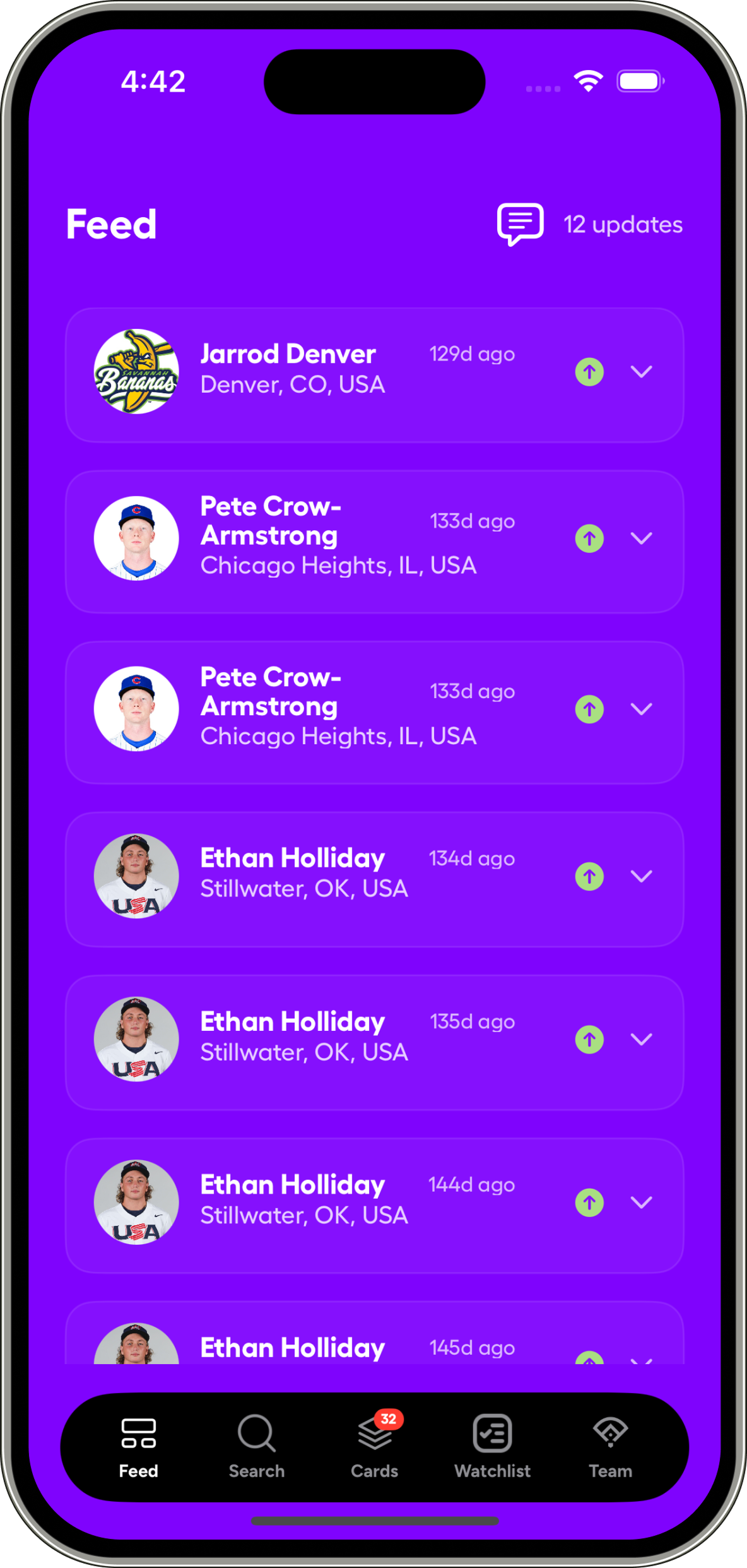 Swipe through player cards in the Cards tab. View detailed stats, Cruit Scores, and performance trends. Filter by location, position, age group, and more.
